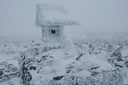 今日は晴れると予想していたが、山頂付近はガスに覆われ何も見えなかった。積雪は12月並みで気温はマイナス4℃。