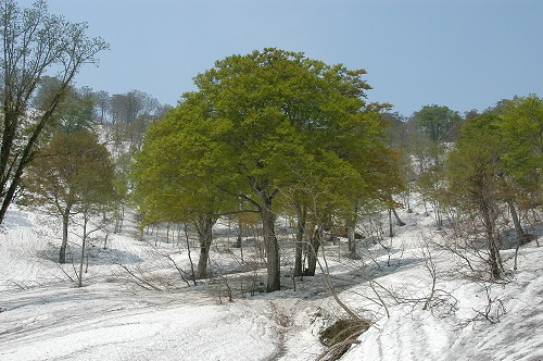 鍋倉山の雪も少なくなり、尾根の雪が途切れ途切れとなってきたので、滑れるのも今週が最後だろう。山頂付近は50cm〜1mぐらいの雪が残っていたが、赤いマークがある付近は、ブッシュが多くて板をスライドさせるのに苦労する。今日は森太郎と森姫を見に行ったが、ブナの根元に○やK454?と書かれたペンキの跡に気付く。