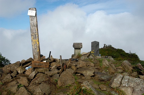 夜明けとともに歩き出し8時前に山頂へ到着した。だんだんと天候が回復してきて、誰もいない山頂でのんびり過ごした。今日は雲が多くて時々青空が見える程度だった。帰りは温泉に寄りたく早めに下山することにした。途中で追い越した地元の人の話だと、この付近はいつも天気が悪いと言っている。だから雨飾山なのか?下山途中で何人もに「もう登ってきたの?」と声を掛けられたが、あんたらが遅いと思う。