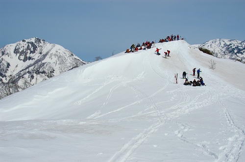 大渚山の山頂は大勢の人達で賑やかだった。山田温泉のツアーだろうか?雪上車に乗って湯峠へ向かった人達だったが、山頂までスイスイっと登って、あっとゆう間に滑って消えてしまった。