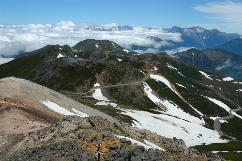 台風一過で眩しいほど空が青かった。 今まで使っていた169cmの板で大雪渓を滑るが、すっかり滑り方を忘れてしまい、140cmの板で滑っていた事を少し後悔する。この時期に大雪渓を滑る人達は、とっても上手で見ているだけでも参考になるが、下手な人がいないので自分の滑りが恥ずかしい。