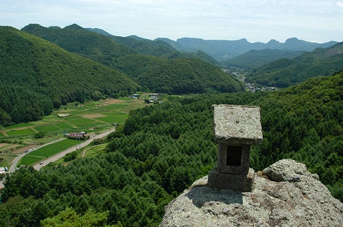 初谷温泉へ行こうと車を走らせてると、岩の上に鳥居が見えた。どっかに登山口があるはずだと周辺を探してみると、中村公園(行人岩)の標識を発見した。「高い所が苦手な方はご遠慮下さい」とのことで、念のためにロープを持って出発する。岩には、ステップが刻んであって、昔から信仰が盛んだったことが伺えるが、岩のトンネルを通過したり、狭い岩の間を通過するなど、太った人には通過が困難かもしれない。頂上には、平成元年に設置された鳥居と祠、灯篭もあって、荒船山や街道沿いの景色が一望できた。