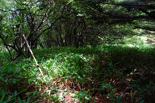 道路脇に赤いテープがあって、もしかしたら寄石山へ続いてると思い歩いてみるが、途中で目印が消えて登山道も不明瞭になってしまった。藪漕ぎをしながら山頂を目指し、熊笹の中をウロウロしてると、取り残されたように三角点がポツンとあった。
