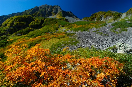 南岳小屋のホームページに横尾本谷のルートが詳しく掲載され、南岳小屋の管理人にも用事があったので、ちょっとだけバリエーションルートを楽しむことにした。ほとんど歩かれてない場所だったが特に問題となる場所もなく、素晴らしい景色を見ることができて大満足。南岳小屋の管理人に常念平からチェックされてたが、誰とも出会うことも無く、本谷カールの紅葉も楽しめた。