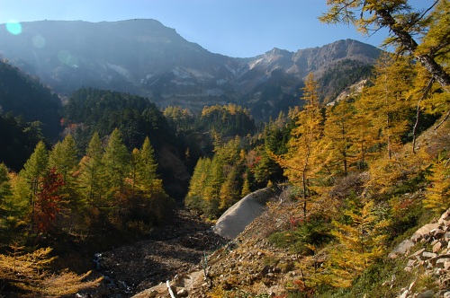 紅葉を狙って訪れた人達が多く、本沢温泉は大混雑だったようだ。テントの受付を済ませ、内湯に入りたいと申し込むも「大混雑してるので日帰りの客には断っている」と言われたが、特別に夕飯の18時頃だったら入浴しても良いと返事を頂き、貸切の内湯でのんびり過ごす。翌日は硫黄岳に登るつもりだったが、とっても紅葉が綺麗だったので、本沢温泉の周辺で日光浴しながらコケモモジュースを頂き、のんびり下って稲子湯で汗を流した。
