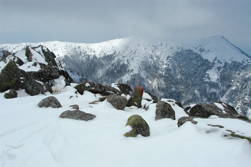 回数券を買って、しばらく遊んでから湯の丸山へ行ってみるが、風に飛ばされた雪が頬に当たって痛い。もう4月になろうとしてるのに雪が30cmも積ってハイシーズン並みになった。 南峰をパスして急いで北峰へ逃げるけど、山頂の標識が無くなってビックリした。誰が移動したんだろうか?