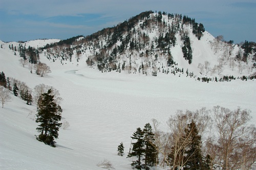 今日はロングルートなので、ウロコ付きの板をチョイスして滑り出すが、板が長すぎて思うようにターンができず、板が沈んでずらすのも大変だった。後半は直下降と斜滑降しか出来なかったが、生コンのような腐った雪に悩まされ、斜滑降するたびにロールケーキを発生させていた。