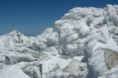 前々日かな?雪が降ったららしく、標高2000m以上は真冬に逆戻り。まっ平になった硬い斜面は、絶えず落石が発生してて下を向く暇が無い。