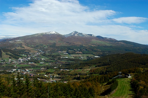 菅平高原の紅葉が見頃で、なおかつ四阿山にも雪が積っているので、見晴らしが良さそうな大松山にやってきた。冬はリフトで山頂まで行けてしまうが、雪の無い時期に登ったほうが芝生の緑と青空が高原らしくて面白いかもしれない。
