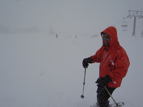 暇人さんを誘って妙高の前山に登るつもりだったが、激しい雪で周囲の状況が分からず、無理して登っても面白くなさそうだったので、ゲレンデ探検隊に変身してパウダーを頂く。 初めて訪れたゲレンデは、真っ白で周囲の状況が分からず、コースマップを見ながらウロウロするが、コース脇へ突入すると雪が重くて止まってしまうので、なるべく直線的に滑ってみた。
