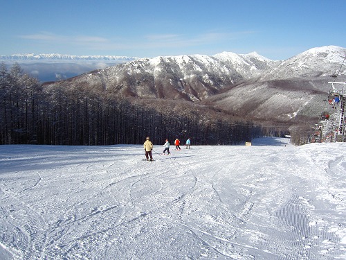 昨日の雨が嘘のように晴れわたり、北アルプスまで綺麗に見える。まだ足が本調子じゃないので、山で滑る気にはなれないけど、ゲレンデもガリガリだったので似たようなもんだった。 アイスバーンの上に5cmほど新雪が積っていたので、コース脇のパウダーは楽しかった。