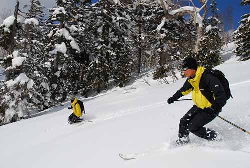 気温が高くて、もう春山になっていると思っていたが、新雪が40cmほど積もっていて、先々週と同じルートで楽しく遊ぶ。雪が軽いと滑るのも楽しいが、長い林道歩きは大変だった。