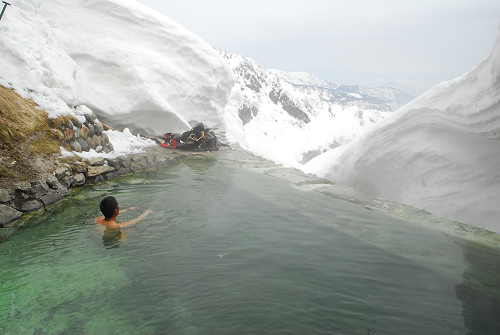 長い距離を歩いて温泉に入ってまったり。まだ時期が早いようでデブリも少なく快適にザラメ雪を滑れると思っていたら、とんでもなく滑りにくい雪だった。