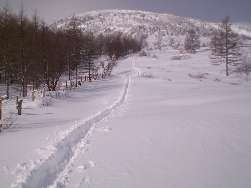 前日から降り続いた雪のおかげで朝から膝下ラッセル。場所によってはストックが埋まってしまうほど。ベースがしっかりしていないので歩きにくい。 新調したがシールが剥がれてしまいツボ足で登ろうとしたが、腰まで埋まってしまい断念。雪が深くて?下りもラッセルだった。