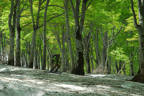 ブナの新緑が眩しい鍋倉山でスキーを楽しむ。