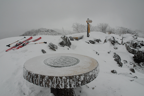 前日の雨の影響で歩きづらく、イライラしながら山頂へ。シール装着したまま山頂直下の急斜面を下ったので、楽しく滑ることなく和田峠に戻った。
