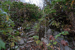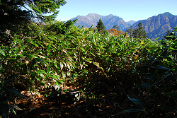 いきなり縄梯子が現れ、トラロープもたくさんある。これから大変な登りになるんじゃないかと思っていたら、梯子は2ヶ所だけで登山道もそれなりである。 穂高や焼岳が見えるようになると笹が増え、ときどき胸の高さまで覆いかぶさる。足元はスッキリしているので歩くには問題無いが、あと数年もすれば完全に廃道になってしまいそうな勢いである。