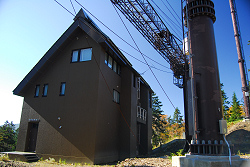 三角点のある場所にやってくると大きな建造物が見えてきた。あんな立派な建物を山頂に作るなんて、きっと地図上には載ってない林道が存在するんじゃないかとキョロキョロ探してみるが、それらしき道路は無いようだ。 鉄塔の名盤には風力発電となっているが、てっぺんにあるはずの羽根は見当たらず、中継所の屋根にはソーラーパネルが取り付けてある。麓に電力を送っている様子は無いので、この設備の専用らしい。