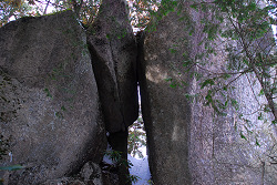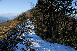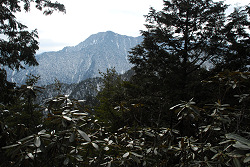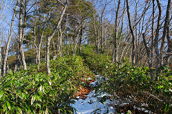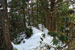 ここから先は、迷わないように慎重に尾根を登っていくが、シャクナゲの森が現れ、前に進むのも困難になってきた。熊笹とシャクナゲ。雪より手強いかもしれない。 |