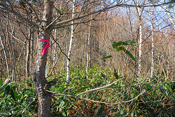 鉄塔の先は、かなり濃い藪となるが、目印があるので、それを追って熊笹の中を泳ぐ。