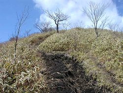 南峰を通過すると熊笹に覆われた見晴らしの良い場所となり、山頂も近い。
