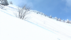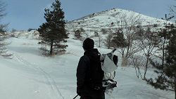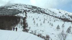 浅間山で体力を使い果たしていたので武田さんのペースに合わせて登って行くのがしんどい。いつもより早いペースでコルへ到着。出発した時間が遅かったのでシュプールだらけになってるかと思いきや、まだ誰も滑っておらず、さっさと準備して樹林帯の手前まで滑ってみる。板を外せば腰まで埋まり、とってもいい感じだったけど、ちょびっと軽さが足りない様である。