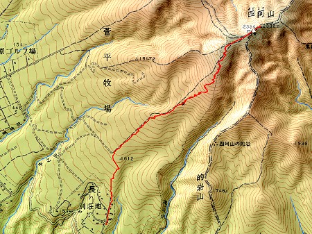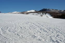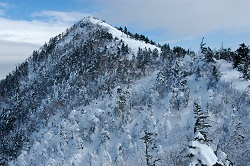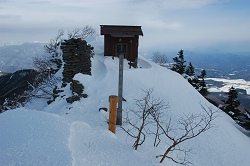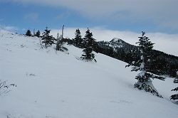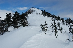 四阿山の山頂も見えてきて、だんだんと斜面も緩やかになってきた。 最近、雪が降ったような気配も無く、何日か前の足跡が残っていけど、稜線付近は北からの強い風でフカフカの雪が積ってた。