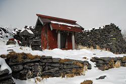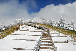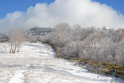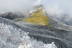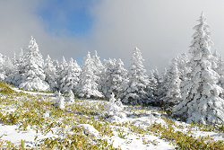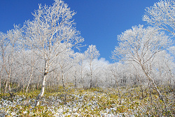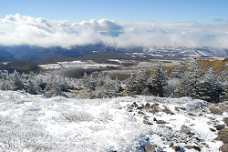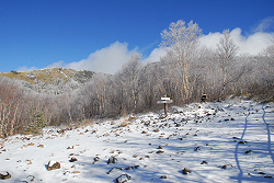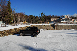 あずまや高原ホテルの無料駐車場に到着すると車の温度計が−5℃を表示している。降りたての雪は、軽くてまだ誰の足跡も無かったけど、この時間に車が無いということは、今日の四阿山は貸切かもしれない。樹氷も期待できそうだし、もしかしたらラッセルも出来るかもしれない。ザックにワカンを取り付けて急いで駐車場を出発する。