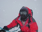 天候が崩れて稜線付近で雪となりました。期待していた雪景色は厚い雲に阻まれ、雲の切れ間から見える穂高連峰に感動してました。 |