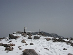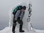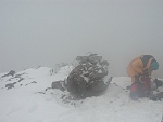 スノーシューを履いて山頂へ。山頂付近はガスで何も見えなかったが、登山者が5人ほどいた。 |