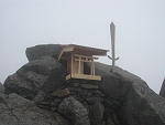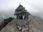 山頂には、たくさんの登頂記念やレンガを積み重ねたオブジェがある。祠に2本のローソクが立てられ、この山を大事に守っている地元の人達がいるようだ。 |