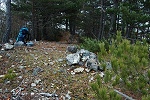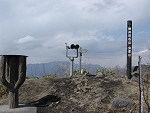 山頂に反射板があるけど肝心の三角点が見つからない。藪の中をゴソゴソ徘徊して、やっと三角点を見つけた。 |