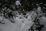 キュッキュッと鳴く雪を踏みしめながら、力水、まめうち平へとやってきた。以前と同じような積雪だが、新たに降り積もったような感じである。まめうち平で休憩してると単独の男性が登ってきた。日帰り装備で軽快にラッセルしてる。つぼ足で追いかけるが、トレースを外すと深く潜るので、ワカンを装着して男性を追い越した。標高2200m付近の沢を横断する頃から雪が深くなり、しばらくがんばって進も、登るのが嫌になり撤退することにした。 |