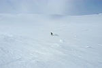 山頂付近の大斜面は快適なザラメで、板を短くしたおかげでテレマークターンも非常に楽になった。ツアーの人達は、途中から沢へと下ってしまったが、ツアー標識に従い尾根を下ることにする。しかし、下るにしたがって雪も重くなり、つんのめるようになってきたので、慎重にジャンプターンしながら林道まで下った。 |