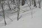 旧鹿沢スキー場から角間峠を経由して角間山へ登ってる途中でカモシカと出合った。こちらはテレマークスキーで行動していたので、それほどラッセルは気にならないが、カモシカはズボズボと雪に足を取られ