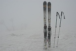 山頂付近は耐風姿勢を取らないと立ってられないど風が強くて、シールを剥がして準備しているとガスに包まれて身動きができなくなってしまった。