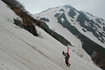 針ノ木岳で滑る最後の日がやってきた。週末になると怪しげな天気予報で、さてさてどうしようかと悩ましてくれたが、今日は5月で1番空が青かったような気がする。140cmのテレマークにしてから、滑りにくい雪質でも気にならなくなり、マヤクボ沢は快適であった。またノドの付近は、他の人達が滑った跡がゲレンデのように綺麗になってて、別の意味で快適だった。 |