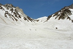 台風一過で眩しいほど空が青かった。今まで使っていた169cmの板で大雪渓を滑るが、すっかり滑り方を忘れてしまい、140cmの板で滑っていた事を少し後悔する。この時期に大雪渓を滑る人達は、とっても上手で見ているだけでも参考になるが、下手な人がいないので自分の滑りが恥ずかしい。 |