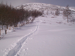 新調したがシールが剥がれてしまいツボ足で登ろうとしたが、腰まで埋まってしまい断念。雪が深くて?下りもラッセルだった。 |