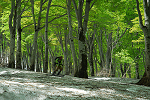 ブナの新緑が眩しい鍋倉山でスキーを楽しむ。山頂では滑る時に参考にさせてもらっているブログの方と出会う。 |