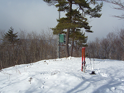 ショートカットするつもりで尾根に取りつく。しばらくすると登山道と合流できズカズカ登って行くが、シールに雪がベットリ張り付き下駄のようになってしまった。気温が高くて表面の雪が溶けていたようだけど、距離が短かったので我慢して進む。天気が良ければ目の前のスキー場が見えるはずだったけど、だんだんと天気が崩れて標高の高い場所は霞んでしまった。
