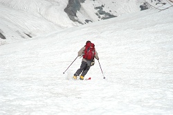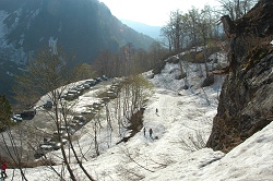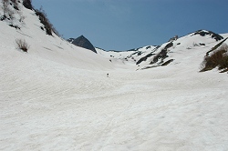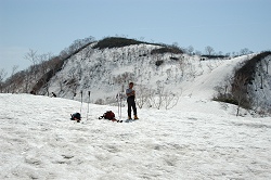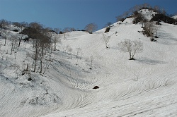 小日向山のコルを越えると急斜面が待っていた。 今日は簡単にズレる板なので慎重にターンしながら大斜面へ移動する。 広い斜面は、数日前に降った雨が深い溝を作り、スキーが引っ掛かって転倒しないかヒヤヒヤしてたけど、何とか駐車場まで滑ることができた。