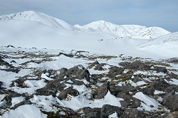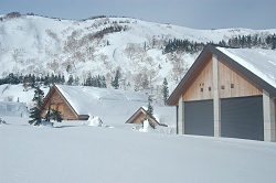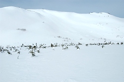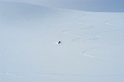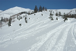 スノーボードに乗る武田さんは、重い雪でも関係ないようで綺麗なシュプールを描いて滑り降りてくる。 貸切だった斜面も、あっとゆう間に遠ざかり、強い風がシュープールを消し始めた。