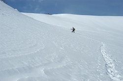 山頂のケルンで記念撮影をしてから荷物をデポした場所まで戻り、急いで滑降の準備をする。滑り出しの部分はツルツルになってて、ちょっと嫌らしいが、慎重に雪質を確認しながら滑り出した。