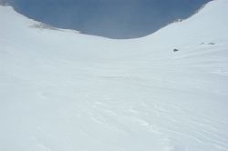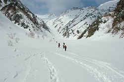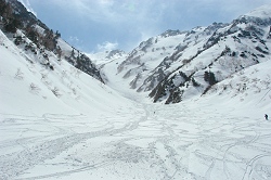夏道を通って雪渓に向かう。いくつか堰堤を越えると真冬のような景色が広がっていた。