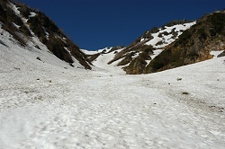マヤクボ沢は、とっても快適で、あっとゆう間にカールの底に到着した。板が短いので板が交差してズルズルと転倒することがあるけど、3500円で仕入れてきたので、そろそろ元を取った気分である。石の上をガリガリ音をさせながら滑っても気にならない。
