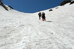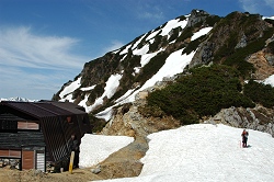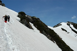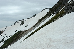 途中で、スキーを背負って犬と一緒に登ってくる人がいたけど、先週も同じ場所で同じような人を見たような気がする。帰りは、犬も必死になって雪渓を走ると思うが、なかなか利口そうなゴールデンリトリバーである。 |