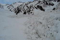 滑走痕の上にはデブリが覆いかぶさっている部分もあるので、きっと数日以内の物だろう。谷を埋め尽くすように広がっている箇所もあるので、帰りはどうやって通るか考え物である。