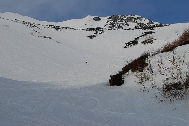 一段下がった所から滑りだすが、疲労のピークに達していたようで数ターンしかできない。踏ん張りも効かないので、のんびり出合いまで滑ると、今度は板が滑らなくなってしまい、バランスを保つのが精一杯となってしまった。