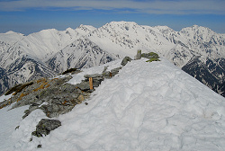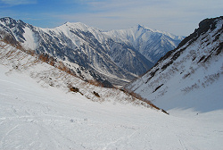 雪が緩んできて、とっても滑りやすい状況になってきた。稜線に上がると槍や立山の景色も素晴らしい。 頂上から滑る勇気は無いけど、とりあえず頂上まで板を担ぎ、のんびり休む事にした。